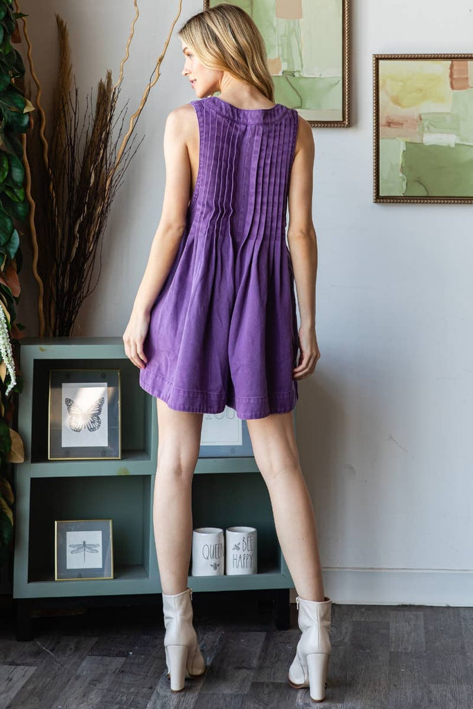 -Washed denim -Deep v-neck with string tie -Pleated detail back -Sleeveless -Side pocket -Mini length -Imported Handwash Cold 100% Cotton Model is 5'10" and wearing a size Small.